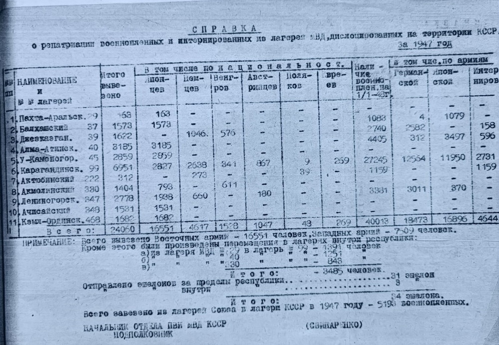 В акте приема и передачи военнопленных 6-й японской армии, датированном 18 февраля 1948 года, «из Ленгерского лаготделения №2 (МВД) управлению лагеря военнопленных №40 МВД КССР было передано 78 офицеров японской армии, 53 солдата и еще 29 человек младшего начальствующего состава». Всего из одного лагеря в другой передали 160 человек. При этом отмечается, что из них «36 человек госпитально-больных».