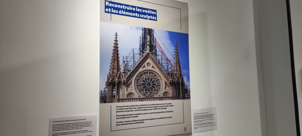 Посетители выставки смогут увидеть путь от трагедии к восстановлению. На 28 тематических панелях показаны этапы реставрации, кропотливая работа специалистов и постепенное возвращение собора к жизни. Например, можно узнать, как по всей Франции искали 2 000 дубов исключительных размеров для восстановления каркаса, как кропотливо чистили 8 000 труб большого органа, как соединяли свинцом стекла многочисленных средневековых витражей, как вручную реставрировали и расписывали настенные картины собора.