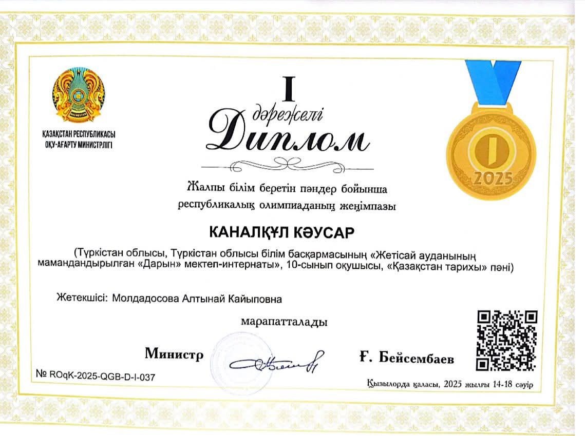 Первые места удалось завоевать ученику 9 класса Туркестанского лицея-интерната «Білім-инновация» Шахнуру Адилову (биология) и ученице из школы им. М. Кашгари г. Кентау Гузаль Нематовой (казахский язык в русской школе).